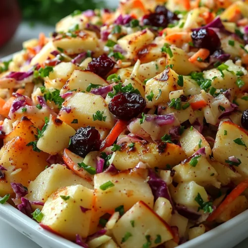 The Flavor-Packed Apple Cranberry Coleslaw Recipe is a vibrant and zesty dish that brings a delightful crunch to your table. This coleslaw combines the tangy sweetness of fresh apples with the tartness of cranberries, creating a perfect balance of flavors. Ideal for a weeknight dinner or as a refreshing side for family gatherings, this coleslaw is both nutritious and satisfying. The addition of crisp cabbage and a creamy dressing enhances its appeal, making it a favorite among children and adults alike. With its colorful presentation and delicious taste, the Flavor-Packed Apple Cranberry Coleslaw Recipe is sure to impress your guests and elevate your meals with ease.