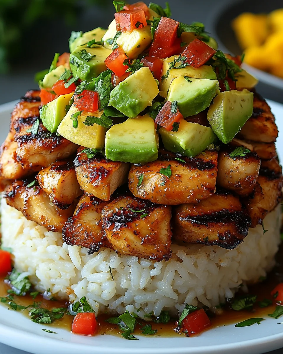 - Remove lid, fluff rice, and add diced avocado on top. Slice chicken and lay it over the rice and avocado. Garnish with cilantro.